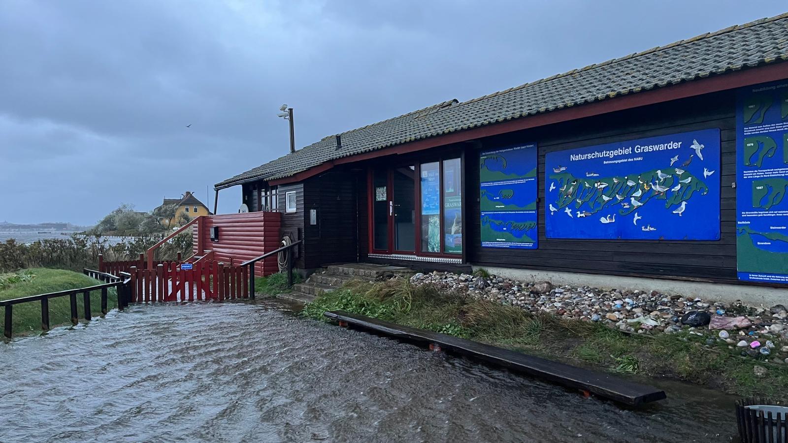 "Hallig Graswarder": In der Nacht vom 20. auf den 21.10.2023 gab es eine starke Sturmflut an der Ostseeküste mit auf dem Graswarder über 1,70m über dem mittleren Wasserstand. Das Atypische daran war der starke Sturm aus Richtung Osten. Dieser verursachte sehr starke Schäden an der Ostküste der Lübecker Bucht. Auch unsere NABU-Station war vollständig vom Wasser eingeschlossen und es ergab sich das Bild einer Warft auf einer Hallig inmitten der stürmischen See.